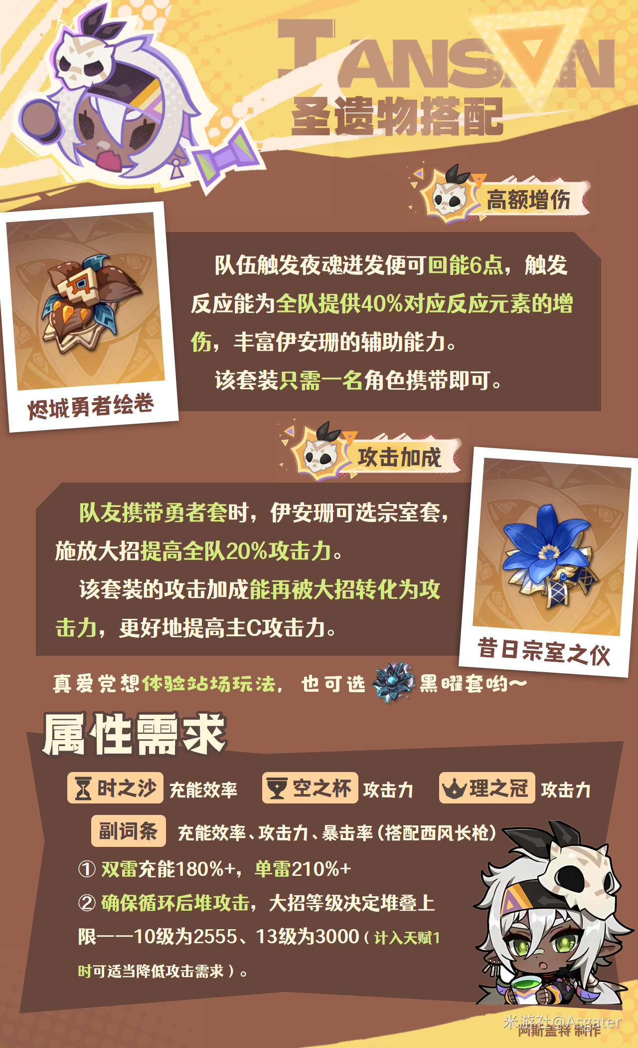 伊安珊是「四星雷长柄攻击力辅助」,可以提升当前场上角色的攻击力面板,根据自身攻击力高低给的辅助数值,在新版本也推出不少新的武器,圣遗物,下面就给大家带来2026伊安珊圣遗物选择推荐。