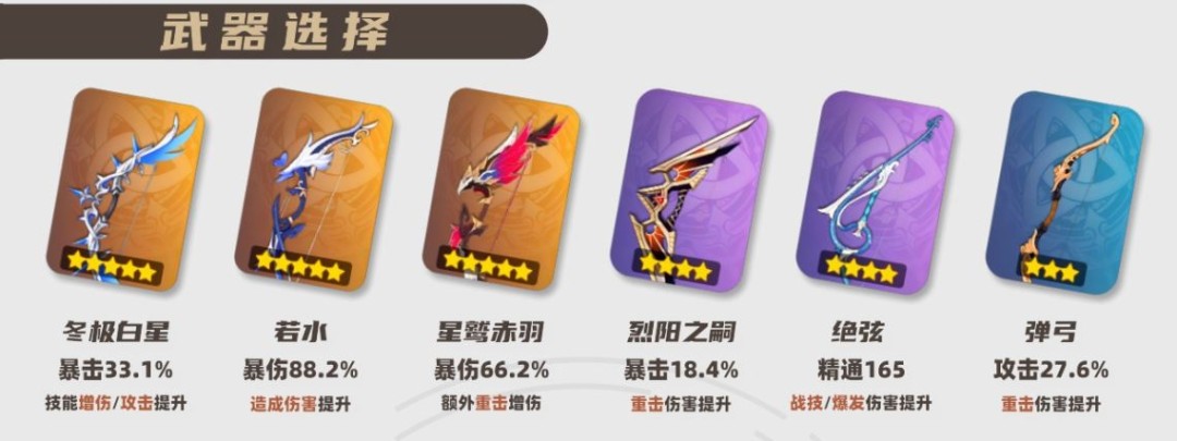 在四星武器中较为推荐绝弦、烈阳之嗣、苍翠猎弓等。
