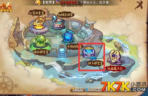 洛克王国地下研究室位置介绍:1、打开大地图,找到钛晶战舰,点击进入;2、进入到钛晶战舰中,打开小地图,就能看到地下研究室啦,点击一下就抵达地下研究室了。