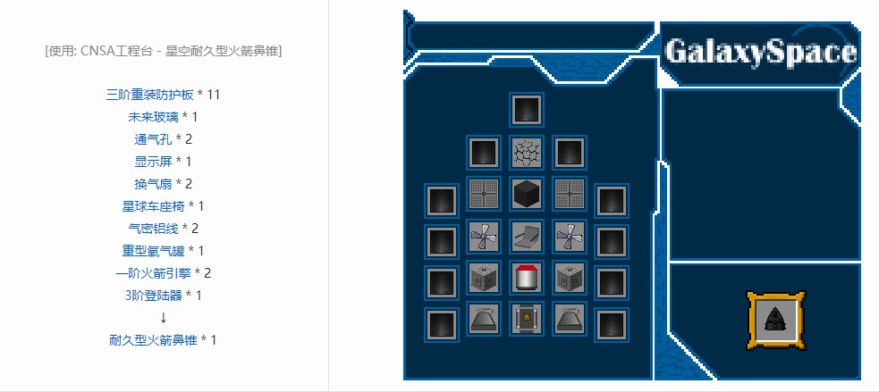 用于制作星系原版的3阶火箭的额外材料,参与合成各阶耐久型火箭鼻锥。