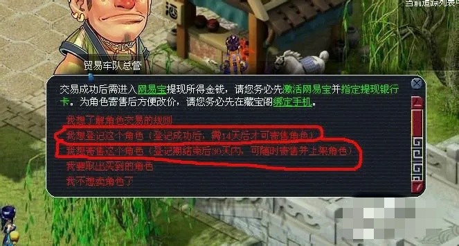 1.找到贸易车队总管,要出售角色就要去他那里,在酒店的上边的桥边;2.一定要全面解锁,并且账号不能欠点,要把第二套和第三套的衣服取下;3.点击车队总管,找到我要交易角色;4.然后需要等级角色,只有登记角色成功以后,等14天才能出售角色。
