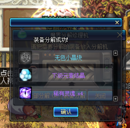 接下来是第二步,很简单,直接拿到分解机处分解好了。随便你是11级分解师或者是普通的阿拉德分解机,只要能分解装备就可以了。这里就要跟大家说一下为什么要选择80级以上的装备了,假紫分解装备会给稀有灵魂,80级以上的假紫分解给4个稀有灵魂,75级的就给3个了,所以不推荐大家买。