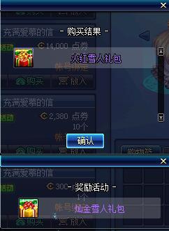本次的雪人礼包可以使用代币购买。购买三套火红雪人装扮后赠送灿金雪人礼包,内含一套灿金雪人套+雪花光环+雪人一觉插图道具,如果想要金色版的雪人外观,那么就要购买三套火红雪人装扮,大家可以考虑后入手。