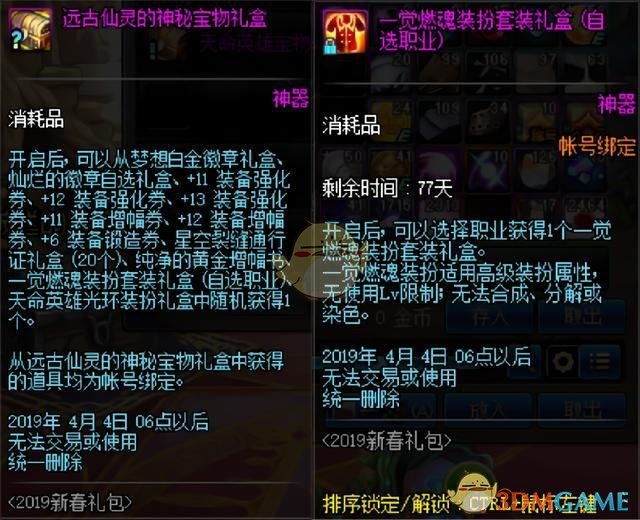 如果我们选择的是远古仙灵的神秘宝物礼盒,那么就是随机去开启宝物礼盒内的东西,如果拿到的是一觉燃魂装扮套装礼盒,那么我们开启的就是一整套的觉醒装扮了,大家对比一下就发现了,随机的显示的是套装,自选的没有套装字样,这样大家懂了吧。