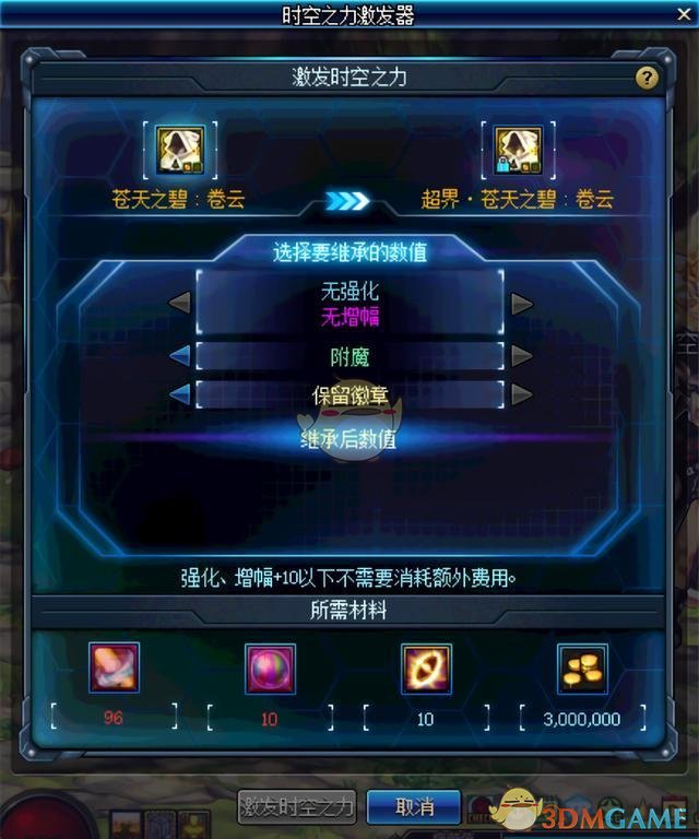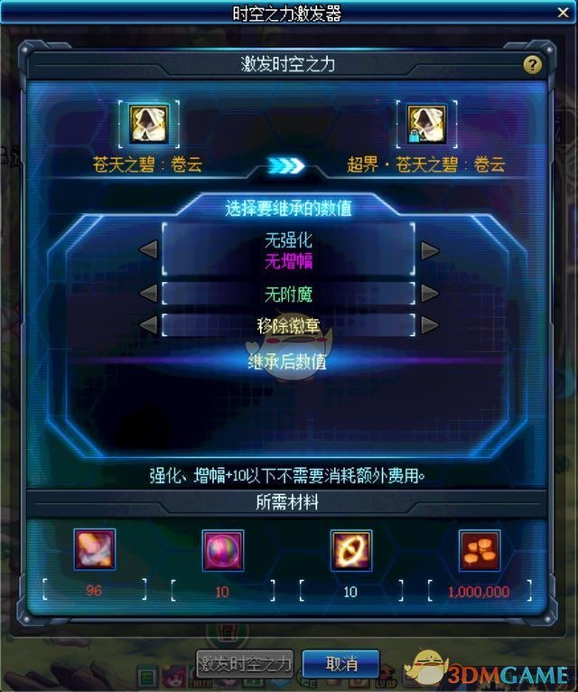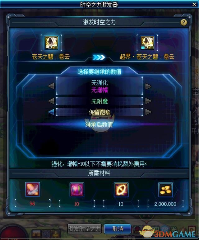 如果我们的泰波尔斯史诗防具没有任何的打造(强化或者增幅10之前),那么升级的费用是最便宜的,需要的材料主要是96个反物质粒子,10个精炼的时空石,10个史诗灵魂,还需要100万金币。但是我们在上面看到了继承的选项,包括继承强化增幅、附魔和徽章三种类型的打造。那么这些属性继承需要花费额外的金币。